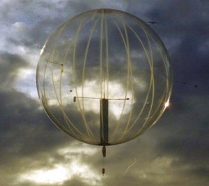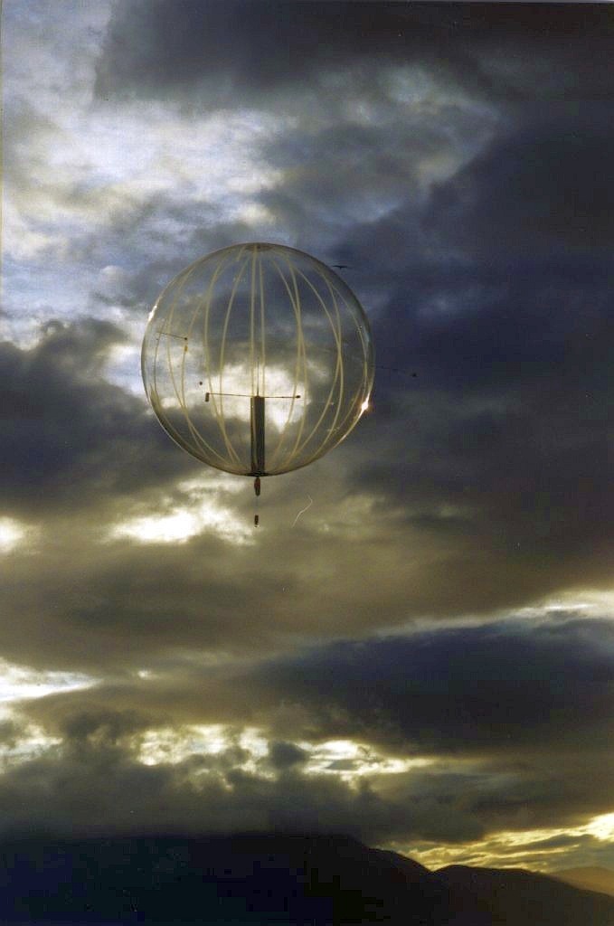 The balloons used -which were Boundary Layer Pressurized Balloons (BLPB) remnants of the INDOEX campaign performed by LMD in the Indian Ocean in 1999- were made of non-extensible polyester with a diameter of 2.5 meters. At left we can see an image of one of them. A polystyrene container attached to the lower pole of the balloon housed all the electronic equipment, including power supply (lithium cells), an ARGOS satellite locator, the transmitter-oscillator, data encoder, and a pressure transducer to measure the pressure inside the envelope. Detaching from that container inside the enevelope, were added two arms holding a Solar Collector and a GPS antenna, while in top of it was placed the Argos antenna. The ambient temperature and humidity sensors, were located hanging at the end of two external arms fastened at the equator of the balloons envelope.