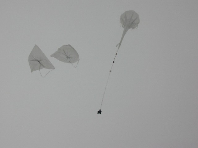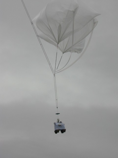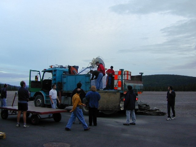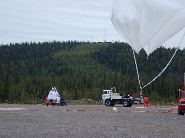 Main balloon inflation The gondola being attached to the auxiliary balloons wich will hold the payload in the launch Once released the main balloon is climbing up. The auxiliary balloons are released too and lift up the gondola seconds before the main balloon get it The main balloon hold the payload while the auxiliary balloons are detached from the gondola and fall in the launch pad The payload back in Esrange after the recovery