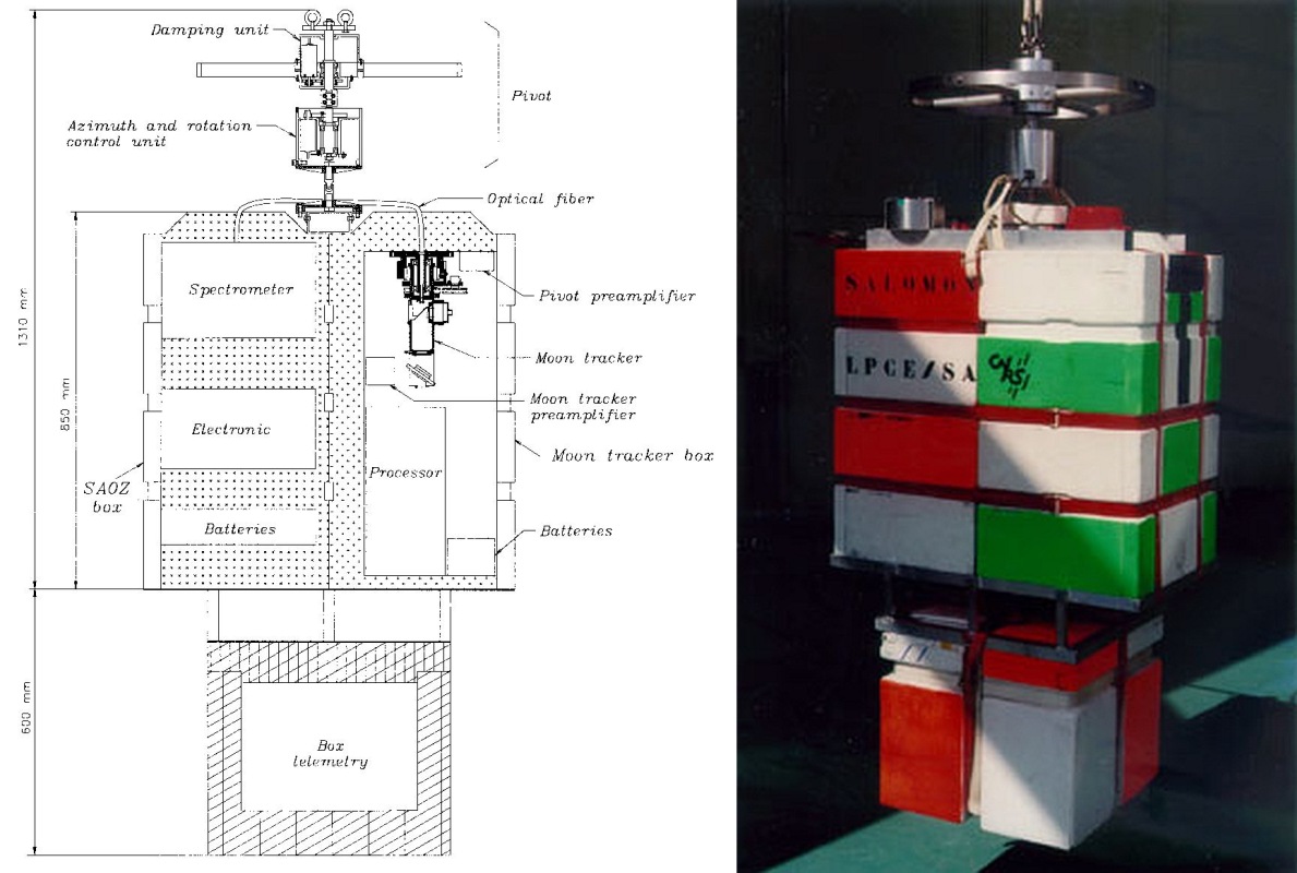 At left we can see an scheme of the instrument (click to enlarge). SALOMON is made from three boxes. The top two boxes, linked by an optical fiber, include a spectrometer and the moon-tracker system. The third, below the two others, contains the CNES telemetry system. The boxes are made from polystyrene, which is well suited for protecting the onboard instruments at landing. The pivot (also known as the primary pointing system) is located above the boxes and links the gondola to the flight chain. The total weight of SALOMON is about 80 kg, which permits the use of balloons in the 10,00065,000-m3 range to reach float altitudes of 27 to 38 km at mid-latitudes.
