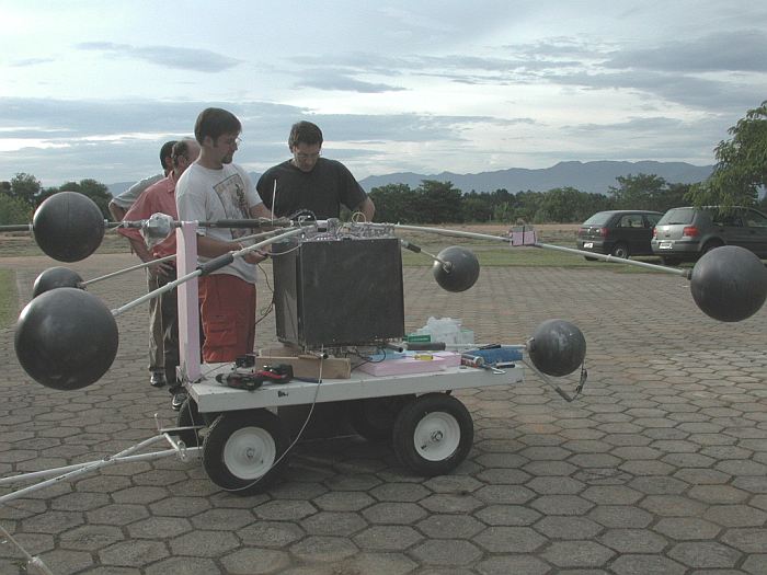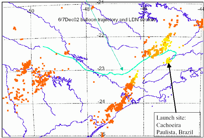 The balloon was launched at 20:00 local time, on december 6th 2002. At about 21:30 the balloon reached its float altitude of about 34km and was heading towards a large thundercloud. For about 1 hour it was flying directly over that thunderstorm. The flight was terminated near 11AM local time when was activated the onboard timer and the payload was cutdown. The balloon path is marked with the green line in the map above.