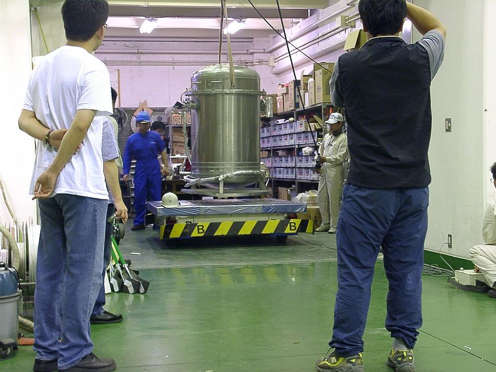 All parts were made of stainless steel and connected to each other with metal gaskets. After assembly, the leakage of the system was confirmed to be minimal by a mass spectrometer leak detector, and all tubing including the sample containers were evacuated for longer than one month to make their insides clean. Prior to air sampling, a similar evacuation was made for about one week, and then the valves were closed and the sample containers were cooled to -269º C by filling the dewar with liquid helium. Total weight of the sampler was about 260 kg.