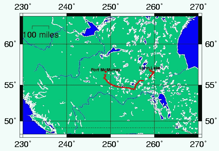 Landing site: 8 miles SSW of Anzac, Alberta, Canada