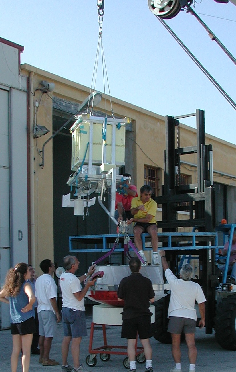 A telemetry box linked the probe to the parachute and balloon. It consisted of an aluminum tubular structure measuring 0.8 m × 0.8 m × 1.0 meters covered with expanded polyestyrene insulating panels and housed the radar transponder, the telecommand antenna, the GPS system and a VAISALA meteorological sonde. Most of the box volume was occupied by the ballast canister containing 100 kg of small lead spheres.