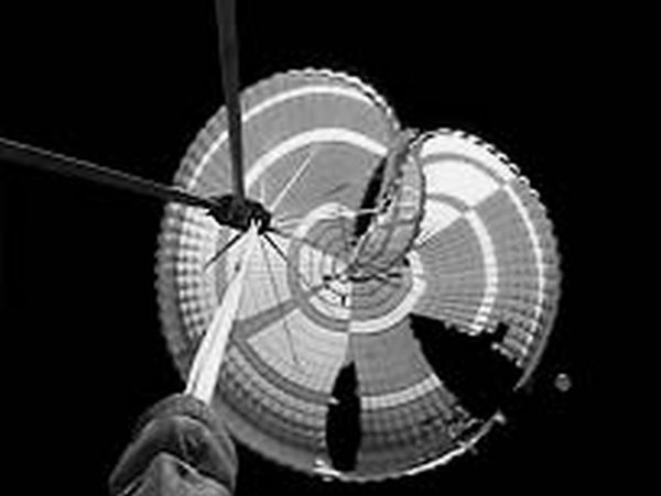 This was the first test in the series. The balloon was launched from the Scientific Flight Facility in Fort Sumner, New Mexico on August 15th, 2004. Launch preparations, launch, and ascent went as expected. The payload was released from 36.6 km altitude. The static line deployment of the drogue was characterized by a large rebound in that canopy. The guide surface drogue still inflated properly and provided the expected drag area for the 21-second acceleration to deployment conditions. The main parachute deployed from the gondola correctly, but suffered a pre-inflation anomaly that resulted in a tangled canopy. The parachute never achieved the proper reefed inflation state. At disreef the parachute suffered structural damage and remained tangled as can be seen in the image at right.