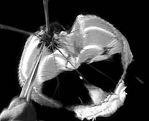 The payload was released from 36.3 km. Drogue deployment was significantly improved from test 1. Main deployment occurred at the correct conditions, however, canopy entanglement and improper reefed state again resulted. At disreef, the canopy suffered substantial structural failure as can be seen in the image at right. Review of the telescope video revealed another apex rebound during deployment indicating inadequate vent control. Inspection of the recovered pieces revealed that the redesigned vent control leash deployed and performed as designed, but the strength was inadequate. The apex rebound drove the vent region of the canopy into the lower inflating portion of the canopy at speeds around 40 m/s. This produced another entanglement and led to the ensuing canopy damage. The significantly reduced drag area of the parachute provided some deceleration to the payload. It touched ground at 16:40 utc 15 nm south of Fort Sumner, NM at coordinates 34º 14.6 North / 104º 10.4 West. Ground impact was estimated at 18 m/s. The crush pad provided significant impact energy absorption, but the gondola suffered some structural deformation and several electrical cables were damaged.