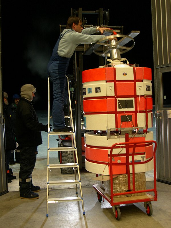 At left we can see an scheme of the instrument (click to enlarge). SALOMON is made from three boxes. The top two boxes, linked by an optical fiber, include a spectrometer and the moon-tracker system. The third, below the two others, contains the CNES telemetry system. The boxes are made from polystyrene, which is well suited for protecting the onboard instruments at landing. The pivot (also known as the primary pointing system) is located above the boxes and links the gondola to the flight chain. The total weight of SALOMON is about 80 kg, which permits the use of balloons in the 10,00065,000-m3 range to reach float altitudes of 27 to 38 km at mid-latitudes.