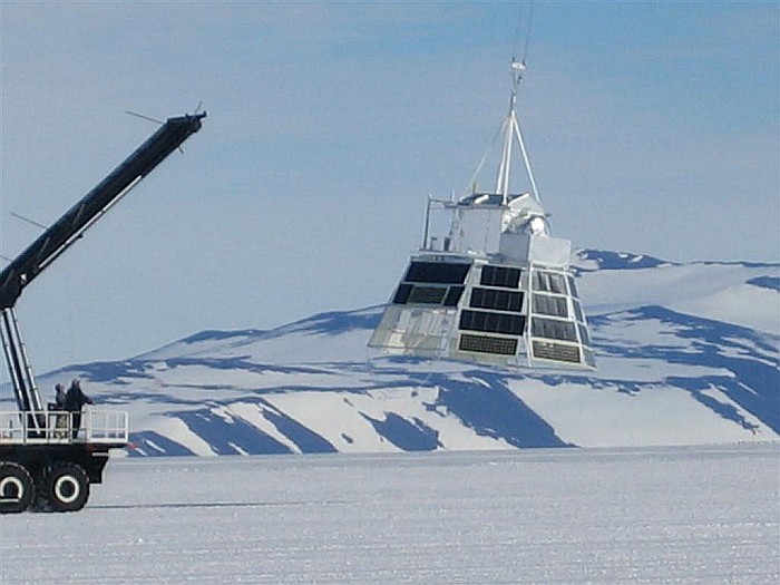 The payload descending with the parachute landed on the Ross ice shelf 43 minutes later at 83°06' S, 155°35' W.
