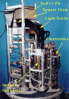 The figure at left shows a schematic cross-section of the BETS detector. It consisted of a shower detector which incorporated an imaging calorimeter, and trigger, data acquisition, and telemetry systems. The shower detector was composed by 36 layers of scintillation fiber counters. The fiber layers consisted of 18 set of two orthogonal layers. Lead plates were put between each layer in order to produce shower particles, whose positions were detected by fiber counters. The end of the fibers were connected to image intensifiers, and the image output was read out by a CCD (Charge Coupled Device) camera. The instrument was able to detect the three dimensional distribution of shower particles electronically.