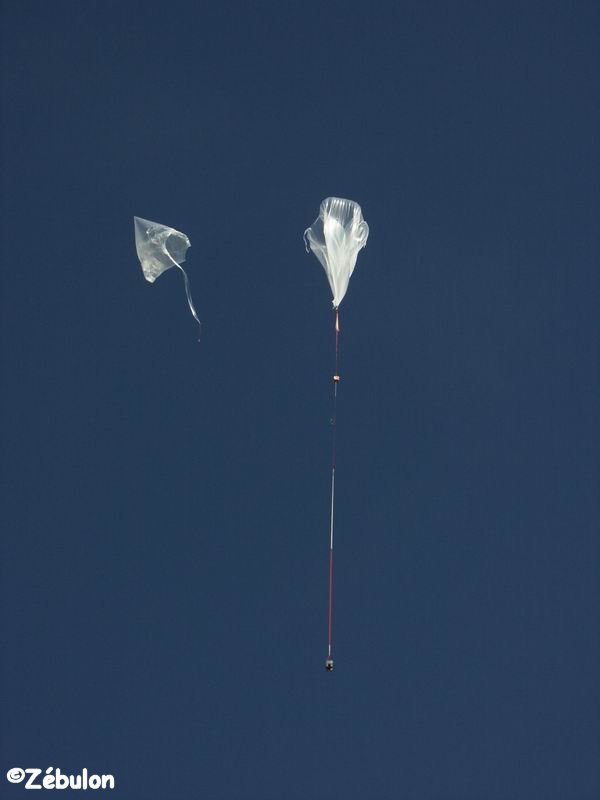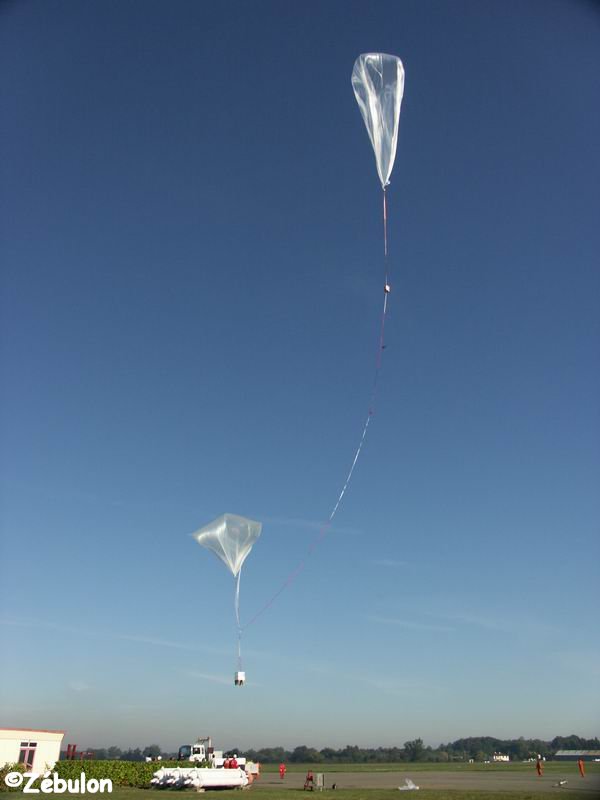 Launch Initial ascent phase. The auxiliary balloon still holds the main mayload The auxiliary balloon release his load The main balloon start the ascent The balloon passing directly overhead