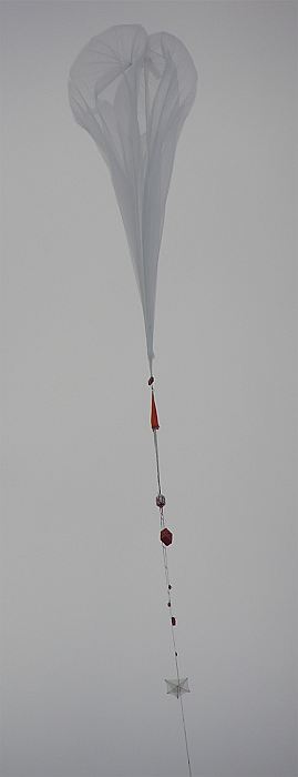 The launch vehicle holding several gondolas wich form the flight train Another view of the flight train. In the foreground the radar reflectors The balloon is fully inflated. Launch is inminent The balloon is released and moves fordward to the launch vehicle The balloon start the ascent