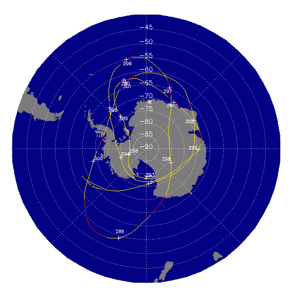 The last known position was over the Antarctic Ocean at coordinates 72.00º S - 10.00º W