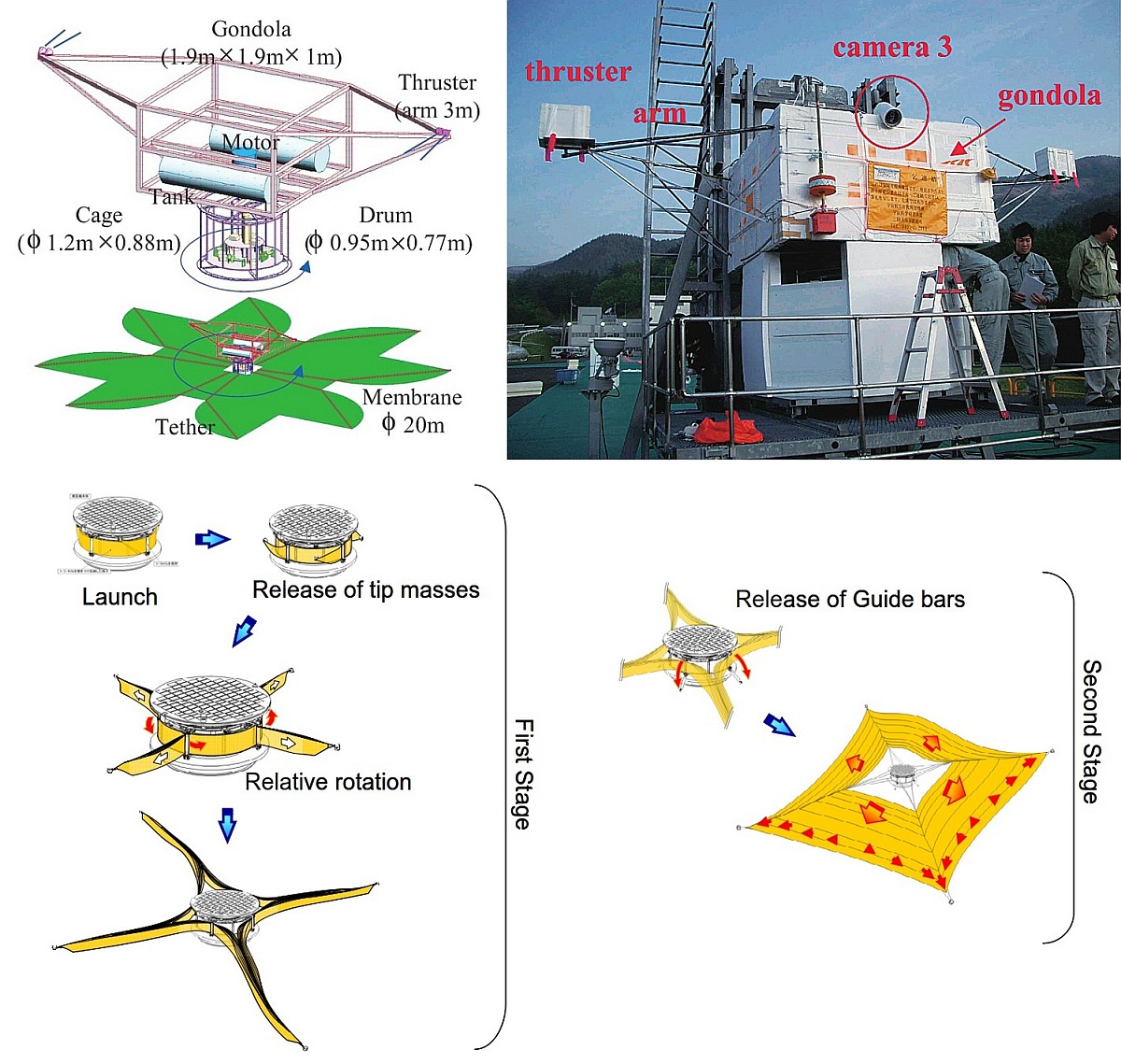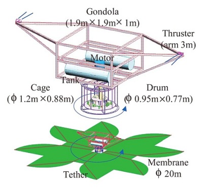 The deployment system was fixed under the sub-gondola and was based on a drum structure. The shape of the drum was octagonal cylinder with a height of 0.64 meters. The sub-gondola had two pairs of thrusters whose arm length was 3.5 meters, which rotated the experimentation system during the mission. A pair of thrusters were counter-clockwise and the another clockwise which accelerated and decelerated the spin, respectively. To control the spin rate, two gyro sensors were mounted on the structure. Two carbon fiber reinforced plastic tanks (each one 150 liters) were located inside the sub-gondola to feed the thrusters. A camera located in one side of the sub-gondola showed the deployment sequence in real time to the ground control.