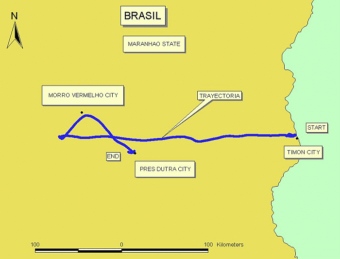 Landing site: Between the cities of Presidente Dutra and Tuntum, Maranhao State, Brazil.