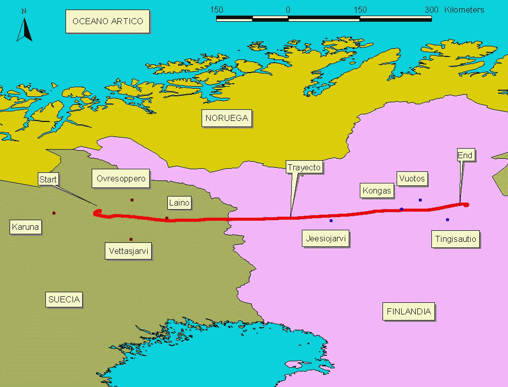 Landing site: 50 km northwest of Tingisautio, in the northeast part of Finland
