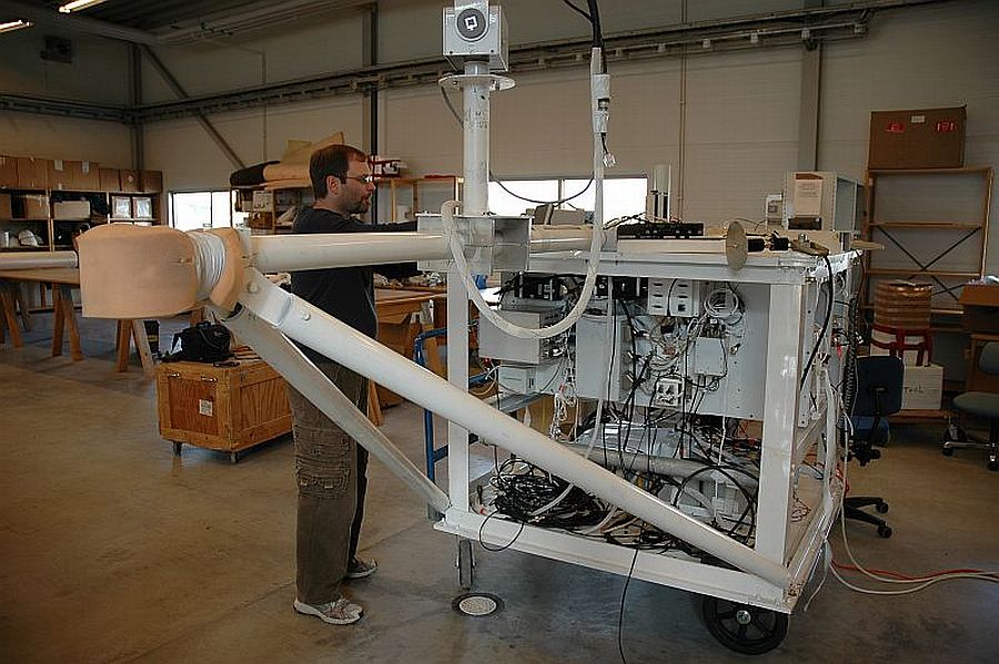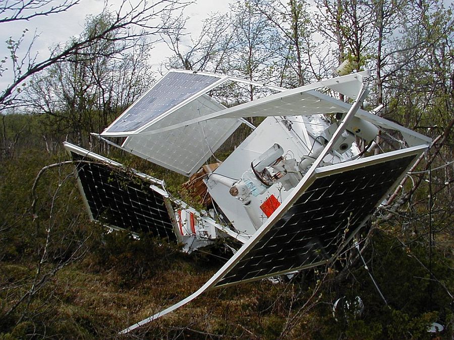 Preparation of the gondola where will be mounted the onboard instrumentation and cameras to examine the balloon during the flight Image of the inflation process. In the foreground is David Smith investigator of the project ULDB. Image of the release of the balloon wich is acquiring the typical cobra head shape. The image was obtained with the ESRANGE's webcam mounted in a nearby hill near the launch pad. View of the balloon from CosmoCam. Can be seen the undeployed portion of the balloon skin responsible of the fail. (Image: Cosmocam) View of the gondola on the landing spot. Although the twisted frame the payload was intact. (Courtesy: Dave Smith)