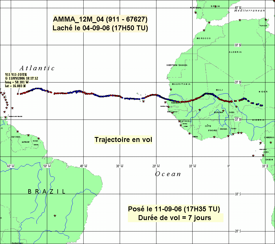 This flight was part of the African Monsoon Multidisciplinary Analysis (AMMA) international project. This was the first time that scientists have used balloon-driftsondes in weather research and prediction. After being launched from Zinder in Niger, each balloon drifted from Africa toward the Caribbean islands at 20kms. Twice per day, each gondola released a dropsonde. In addition to tracking potential hurricanes, the balloon-driftsondes gathered bird's-eye data on surges of hot, dry air that cascade into the Atlantic from the Sahel region of Africa.