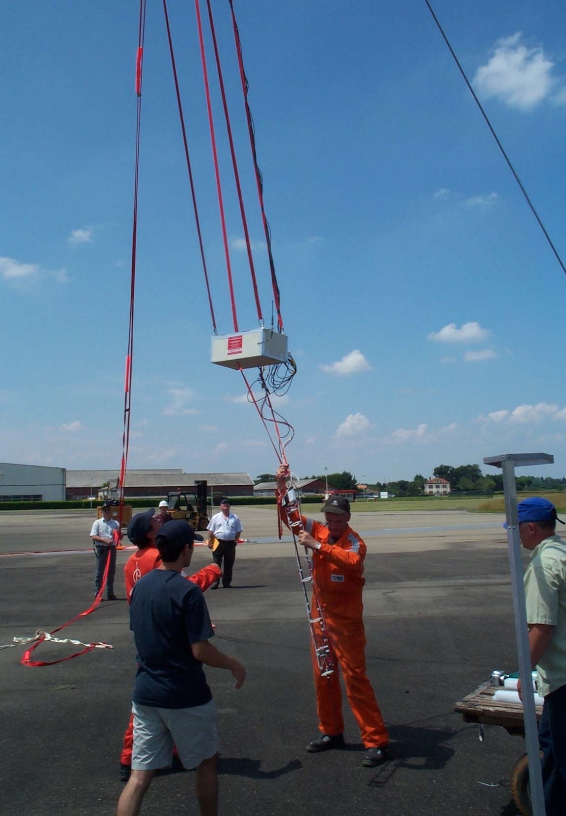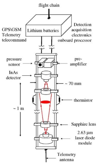 In the figure at left we can see a scheme of the mounting of the laser sensor. The principle of the sensor is simple: the laser beam is propagated in the open atmosphere where it is partially absorbed by ambient H2O molecule, then, the amount of absorbed energy is related to the molecular density using the BeerLambert law. The laser diode is mounted in a small mechanical module made of aluminum and Teflon. Great care was taken in the thermal design of this laser module because of the large variation of the ambient temperature encountered during a balloon flight. Two fiber carbon tubes are used to maintain the laser diode and the 1 mm diameter InAs detector at a one meter distance apart. Two Sapphire lenses with a focal length of 25 mm and anti-reflection coated are used to ensure the optical combination. Simultaneously to the in situ absorption spectra, the atmospheric pressure and temperature are recorded using a small pressure gauge and three meteorological thermistors. To prevent pollution by H2O outgassing from the balloon envelope, a long flight chain is used.