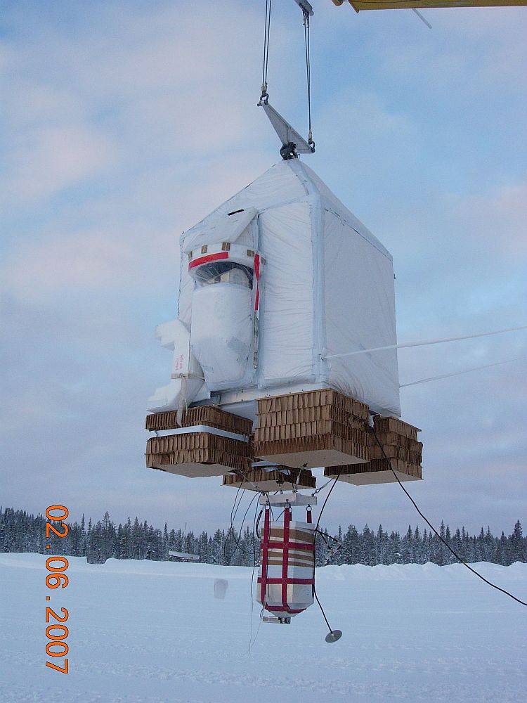 The instruments are mounted in two specially built gondolas measuring 6 ft. by 6 ft. on their sides by 18 ft height and another half the height. At left we can see an image of one of them. To perform the measurements of atmospheric trace species is used the technique of solar occultation, in which the direct Sun is viewed through the atmospheric limb thus providing long atmospheric paths and hence high sensitivity to trace species. The type and number of the instruments may vary from flight to flight but range from photometers and radiometers to spectrometers and interferometers.