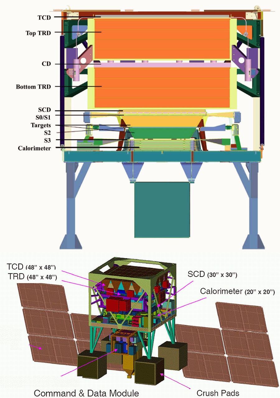 Below the TRD modules lies the calorimeter module, comprised of several parts. At the top is located the Silicon Charge Detector (SCD) comprised of 26 ladders arranged in an aluminum frame each holding 7 sensors fabricated from a single high resistivity round silicon wafer. To minimize back-scatter noise each sensor is segmented into a 4x4 array for a total of 2912 channels.