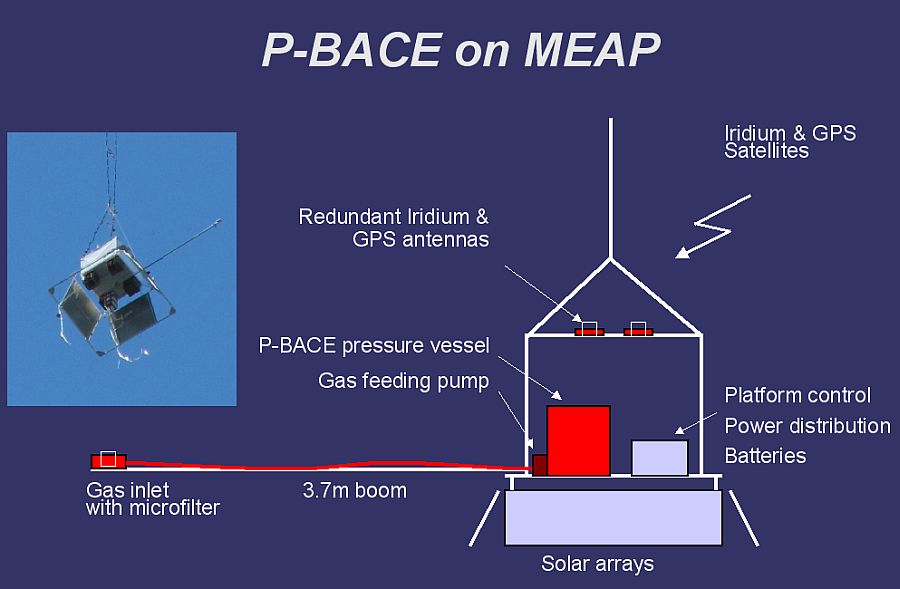 The scientific payload carried on the MEAP gondola was P-BACE (Polar Balloon Atmospheric Composition Experiment), a neutral gas mass spectrometer of the time-of-flight type for the analysis of ambient atmospheric gas which was originally developed to study the Martian atmosphere from a landed spacecraft. It consists of a sealed pressurized vessel containing most of the instrument and an external gas inlet system with a micro particle filter at the end of a 3.7 m long boom. The system received and transmitted telecommands and telemetry via its two own Iridium satellite modems with integrated GPS receivers, independent of the platform communication systems. This separation simplified considerably the interface between P-BACE and MEAP. During the flight, this communication link can be used to optimize instrument settings and to download quick look science data. Full science data is stored onboard on two redundant solid-state disks, to be recovered after the flight.