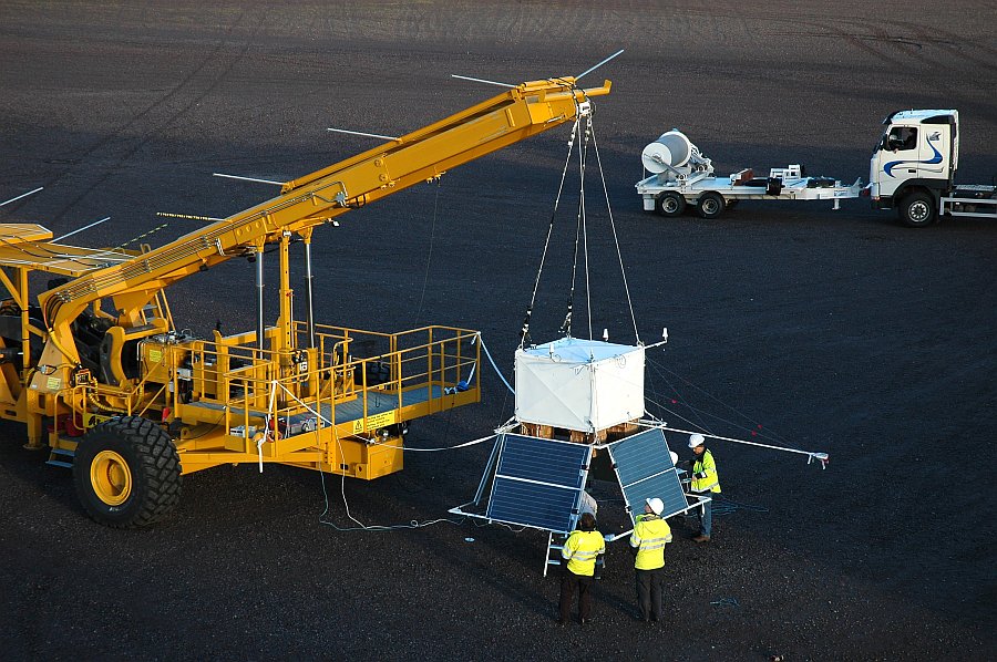 The gondola main platform, whose scheme can be seen at left (click to anlarge) was built from a composite honeycomb plate of 1.6 m x 1.6 m with reinforced attachment rails for the payload. An aluminum frame of 1.2 m height provided support for the roof of the gondola. A secondary platform right under the roof provided additional mounting area for more lightweight equipment. All four sides of the frame structure were closed by aluminum panels painted of white. Solar panels were suspended on each side in a frame below the main platform. Solar cells were fitted directly to lightweight aluminum honeycomb plates to save mass and to serve as shock absorbing structure during landing. The ballast container was suspended using wires underneath the main platform between the solar panels. Several booms extended from the main platform, the longest with 3.7 m length supported the gas inlet filter for the P-BACE instrument, two short booms were used to get sufficient spacing between individual global positioning system (GPS) and Iridium communication antennas to avoid interference.