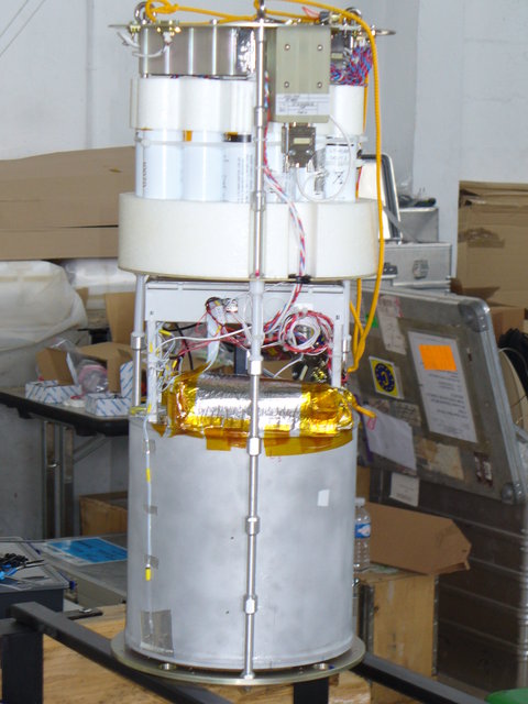 At left can be seen the MULID payload during the assembling phase. The squared structure on the top is necessary to sustain the carbon fiber and mylar reflecting shield. The optical box is mounted near the focal point of the telescope (click to anlarge). MULID is based in the so called "Microjoule concept" that implies the use of a lidar with small pulse energy and large repetition rate in a system prepared to fly for several weeks unattended, at very low temperatures and with large day/night temperature variations inside the gondola. The instrument have the capability to measure the depolarized signal backscattered by cloud particles. Such measurements are easily linked to phase and dimension of the scattering particles.