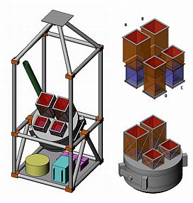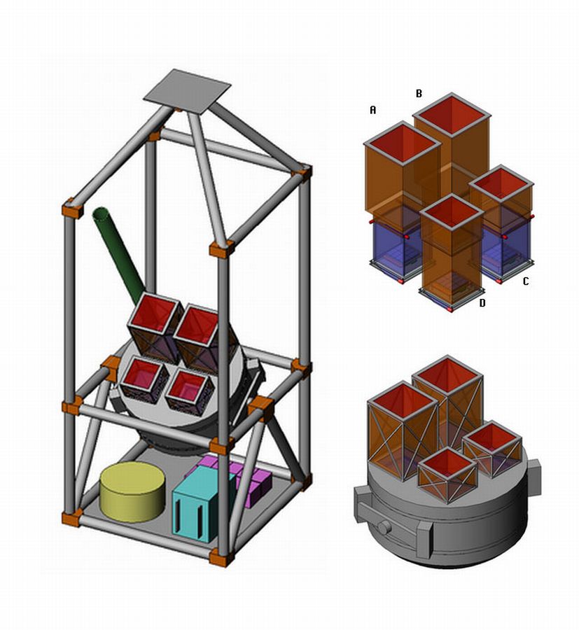 All four telescopes point at the same section of the sky and have identical CZT detector planes (16x16 cm2 each, 0.5 cm thick) to simplify the comparison of the performance of the different shielding configurations. Each detector plane is surrounded by shields. In the scheme at left, these are identified by colours. Four telescopes have an identical rear CsI active shield (blue). On regard the sides, there are two types of shielding configurations: two telescopes (A, C) with the combination of CsI active (blue) and Pb-Sn-Cu passive shields (light brown), and the other two (B, D) with Pb-Sn-Cu passive shields only. Also there are two types of Fields of View (FoVs): narrow FoV (A, B) and wide FoV (C, D). This two by two configuration allows a better identification of each internal or difusse background component.