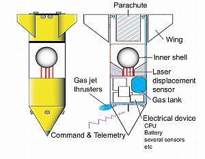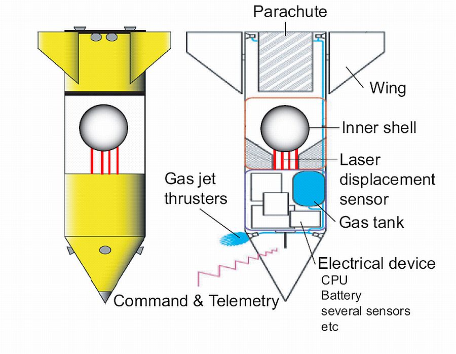 However Japanese scientists returned to this concept and developed since 2004 the Balloon-based Operation Vehicle (BOV). It consists of two main parts: a flight capsule body rocket-like shaped (outer shell) and an experiment module that floats free in the interior of the capsule (inner shell). The system is carried to the stratosphere by a new kind of balloon capable of reaching 40 kms of altitude, thus assuring 30 seconds of good quality microgravity. To allow this, the inner shell must be isolated from the outer shell so no disturbance forces work on it during the free-fall. At left can be seen a detailed scheme (click to enlarge). BOV measures four meters of length, 0.55 mts of diameter and weights 310 kgs. As can be seen in the image it have a rocket-like shape to reduce aerodynamic disturbance.