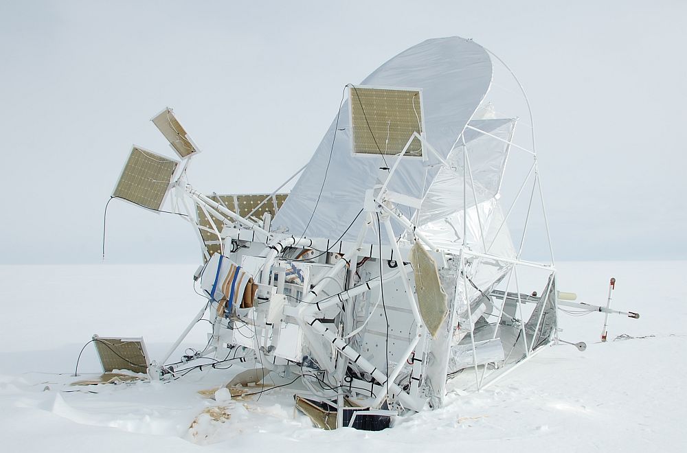 After the long descent under parachute, the payload landed 300 miles SSE of the launch base. In the map at right is plotted the entire flight path of the mission. Althought the impact site was located in terms of Antarctic distances "close" to the base the weather was not much cooperative during great part of January, forcing to cancel the recovery effort over and over. It was finally completed in the first days of Febraury. By the way, the instrument suffered only cosmetic damage.
