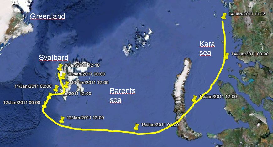 The balloon was launched from Ny Alesund, Spitzbergen Island on January 9, 2011 at 12:30 utc in mild conditions with a temperature of -8º C and wind of 1 kts until inflation began when the winds rose to 12 kts throughout the inflation and launch. Ironically, after the balloon was released from the spool the winds calmed down again and remained calm for the next 24 hours. The balloon maintained a nominal ascent and remained at the prescribed float altitude for 5.5 days. The trajectory shown in the map above confirms that the stratospheric winds during the winter months can support a Long Duration Balloon (LDB) flight.