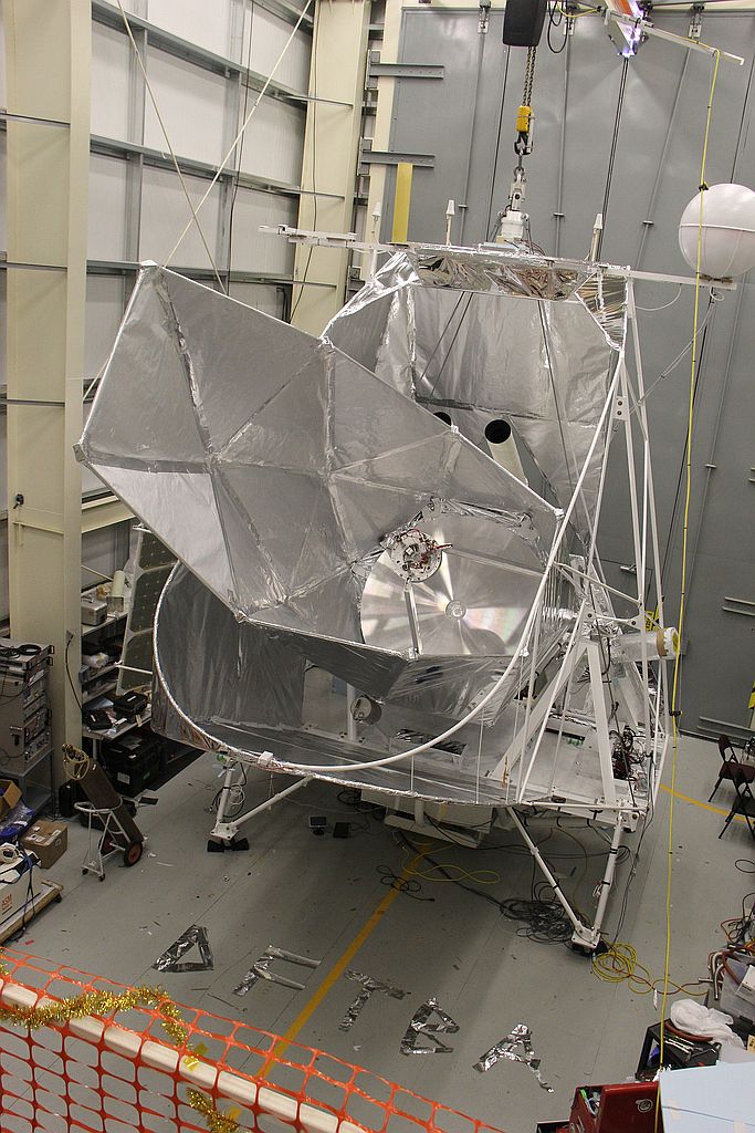 The outer frame is pointed in azimuth using two elements: a reaction wheel with a diameter of 1.5 m made of 7.6 cm thick aluminum honeycomb and a vertical axis pivot at the attachment of the gondola to the flight train, which also minimizes the external torque from wind shear acting on the gondola and balloon rotation. It also provides mounts for various electronics boxes, including the flight computers, the CSBF electronics, various pointing sensors, and flight batteries.