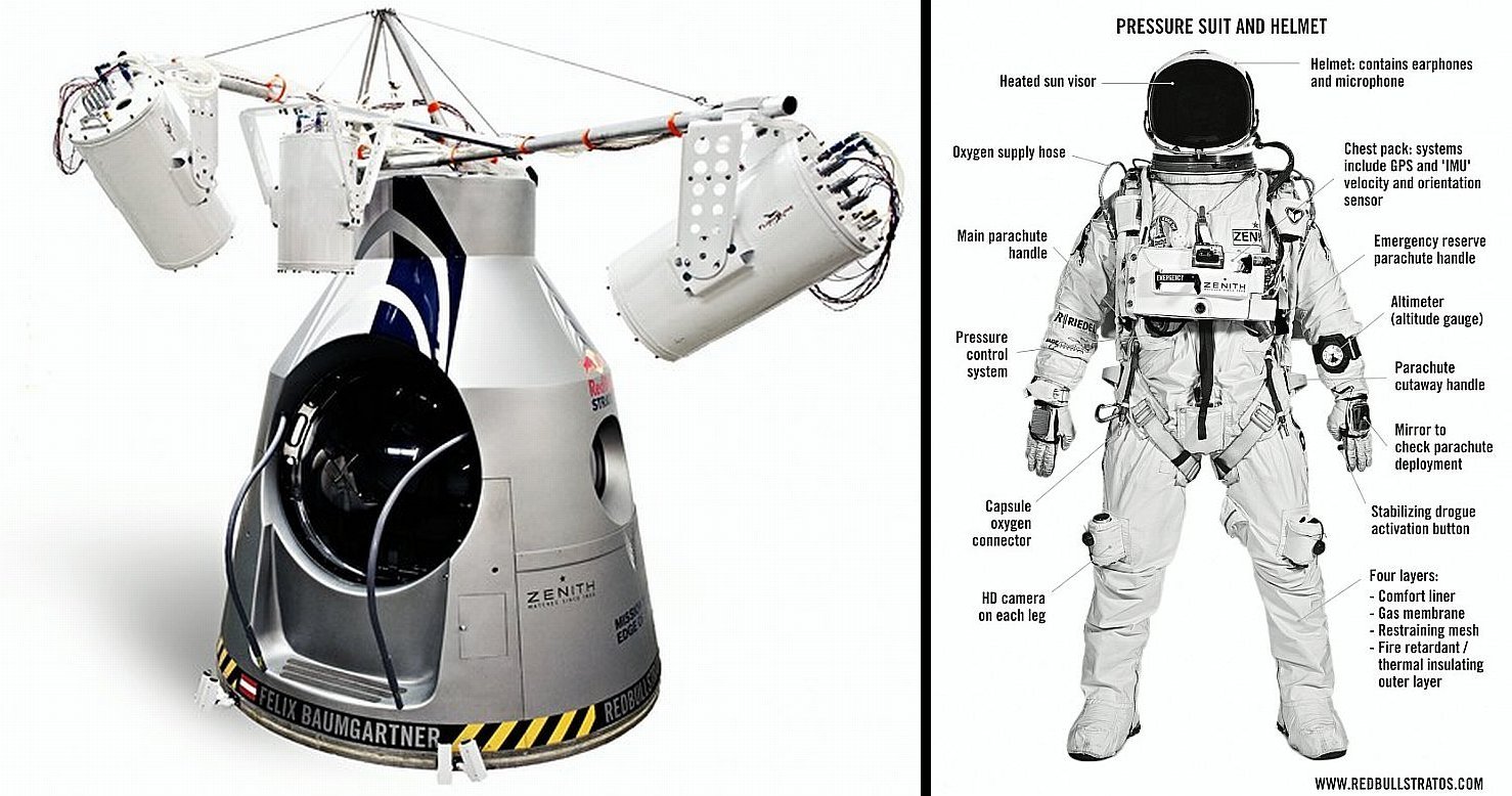 Its purpose is to isolate the pilot from the extreme stratospheric temperatures, to avert symptoms of decompression sickness and to maintain pressure around his body. Althought it was modeled on suits worn by pilots of high-altitude reconnaissance aircraft, it has been custom made to the pilot's measurements and modified with new enhancements. The key factor was mobility as the pilot needs to have more freedom of movements for a better control of the body attitude during the fall. Thus was designed a special rotating locking neck ring that attaches the suit to the helmet as well gloves attachments. Several small mirrors were located strategically on the suit, to overcome the limitations on peripheral vision impossed to the pilot by the helmet.