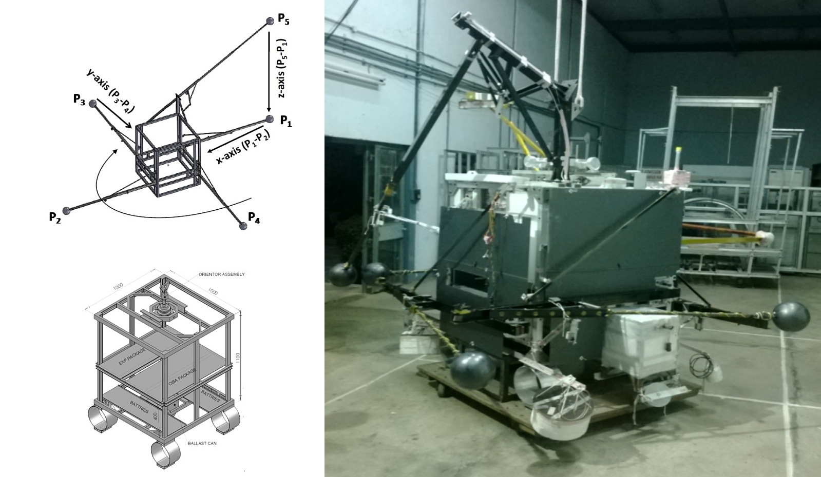 All five probes were identical 20 cm diameter aluminum spheres coated with Aquadag, a conducting carbon paint used to minimize the work function differences between them. Each of the four booms to where the horizontal x and y probes were mounted was 3 m long, with its outermost 1 m made of insulating fiberglass rods and was kept in stowed condition prior to the launch. The gondola dimensions were of 1 meter each on all sides. The probe-to-probe baselines achieved for the x and y probes were 6.92 and 7.02 m, respectively. The probe-to-probe baseline achieved in the vertical direction was 2.82 m.