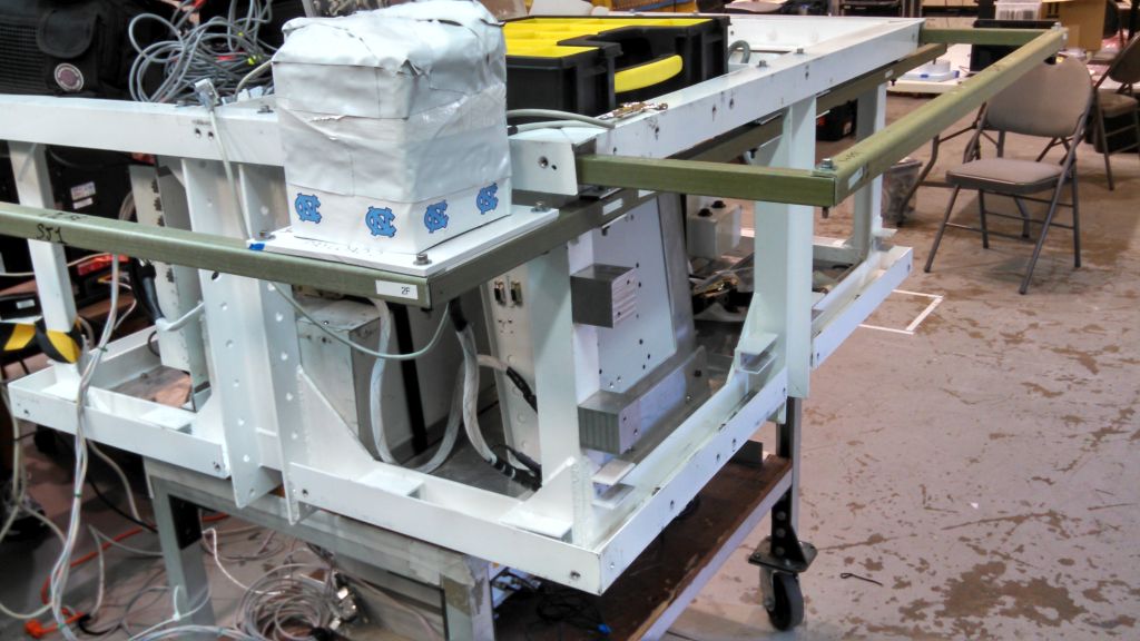 extends 56 cm away from the aluminum frame and supports two student payload mounting plates, each of which includes standard mechanical, power and serial communication interfaces. One such brace is attached to each side of the core structure to accommodate up to eight student payloads. This configuration was chosen to minimize interference between the metal frame and any student payloads that may exercise their transmitters during flight. In addition, up to four large (< 10 kg) student payloads can be mounted on the top of the core structure and have a power and communication interface similar to that of the small payloads.