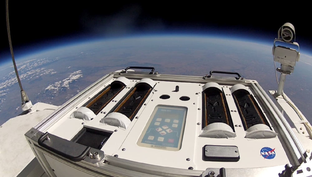 E-MIST (Exposing Microorganisms in the Stratosphere) developed by NASA's Kennedy Space Center (KSC), aimed to understand how spore-forming bacteria, commonly-found in spacecraft assembly facilities, can survive in a harsh space-like environment. E-MIST was contained in a special carrier that was conceived and built at KSC's Prototype Development Laboratory. The 80-pound structure featured four doors that rotated to expose up to 10 experimental samples each for a predetermined period of time. The structure -which can be seen in the last image at lower right- also had a control board for autonomous operations and customizable avionics, power, environmental controls and sensors.