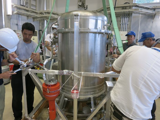 All parts were made of stainless steel and connected to each other with metal gaskets. After assembly, the leakage of the system was confirmed to be minimal by a mass spectrometer leak detector, and all tubing including the sample containers were evacuated for longer than one month to make their insides clean. Prior to air sampling, a similar evacuation was made for about one week, and then the valves were closed and the sample containers were cooled to -269º C by filling the dewar with liquid helium. Total weight of the sampler was about 260 kg.