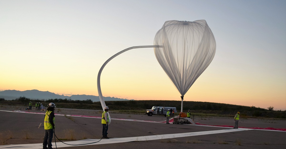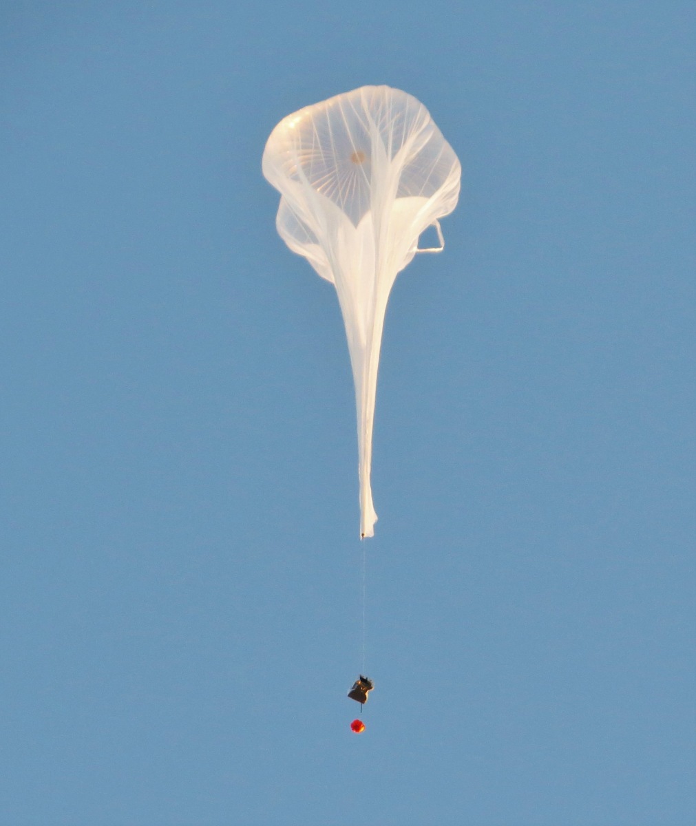 Hang test of the instrument at SwRI HQ (Image Courtesy of Southwest Research Institute) The balloon being inflated (Image: World View) The balloon ready to be launched (Image: World View) The balloon ascending (Image: NASA FOP)