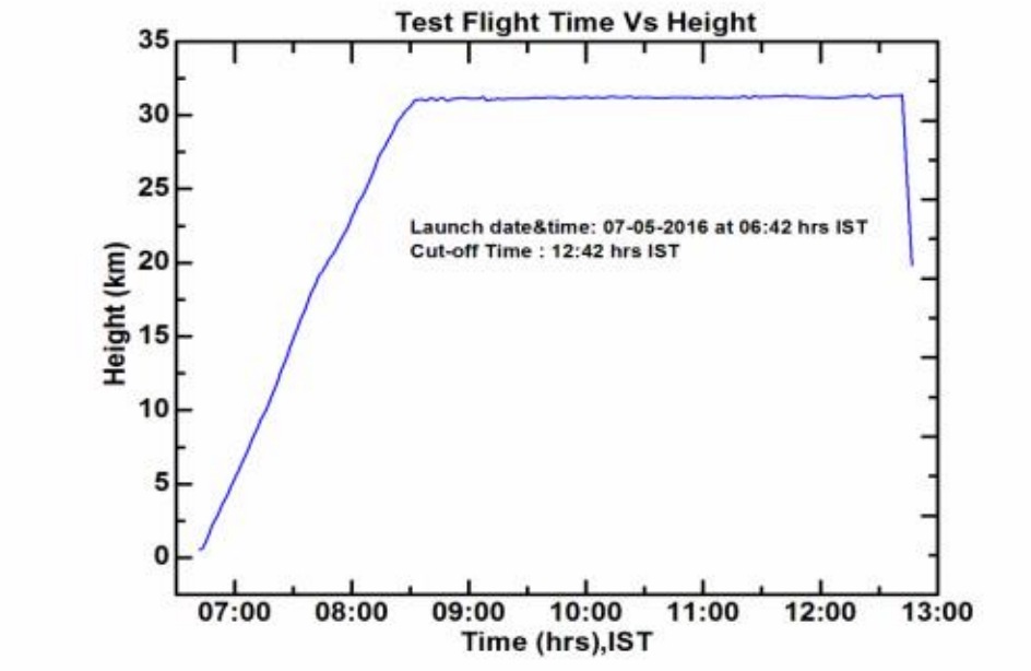The initial launch was proposed to be conducted before sunrise on May 6th 2016, however, weather conditions deteriorated rapidly and delayed the launch till the next day. The balloon was successfully launched from the National Balloon Facility in Hyderabad on 7th May 2016 at 6:42 hrs India Standard Time (IST). It reached desired ceiling altitude of 32 km at 8:36 IST after an ascent time of 1 hour and 53 minutes at an average rate speed of 4.59 meters per second.
