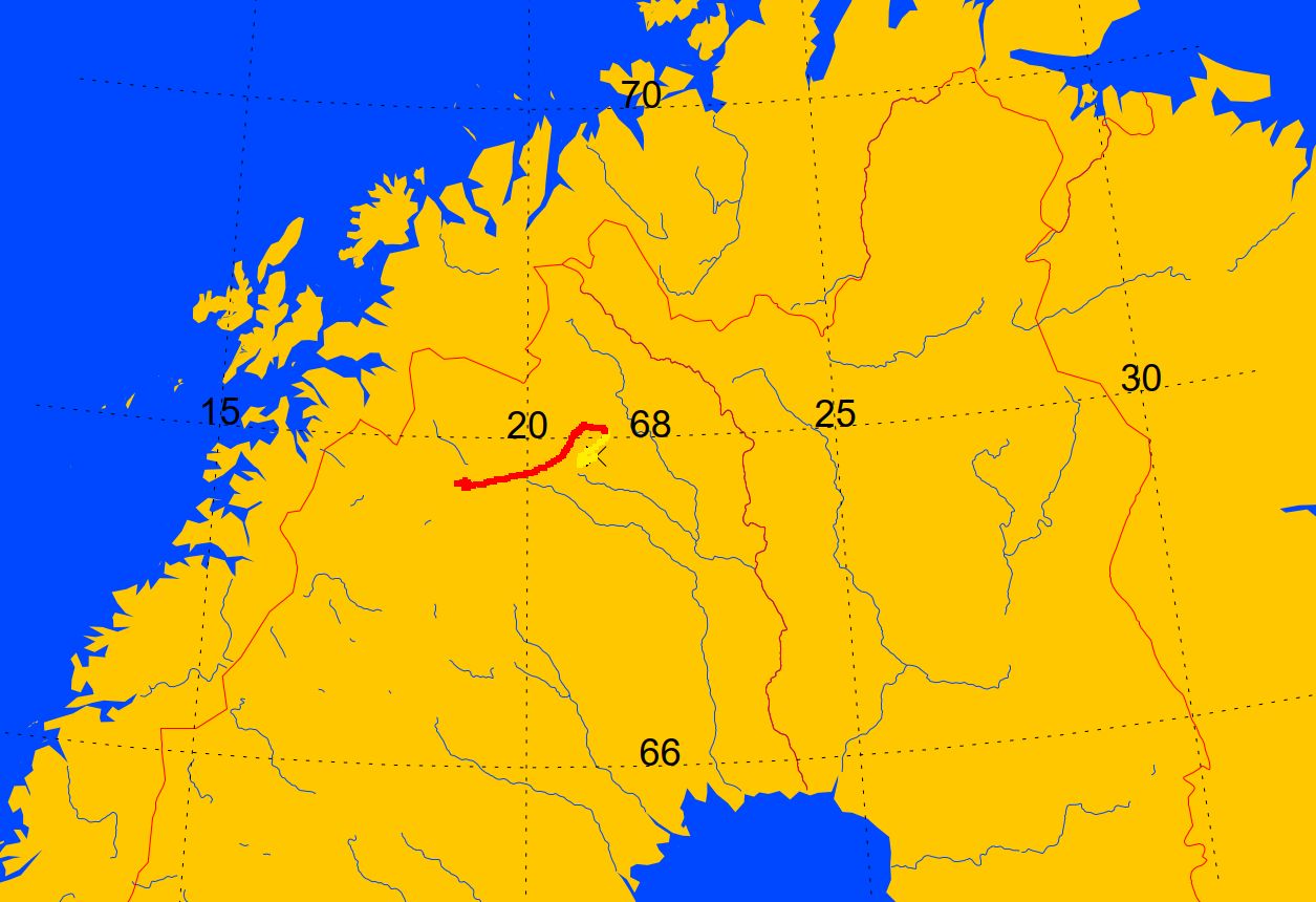 Landing site: At coordinates 67.72N, 18.88E, Sweden