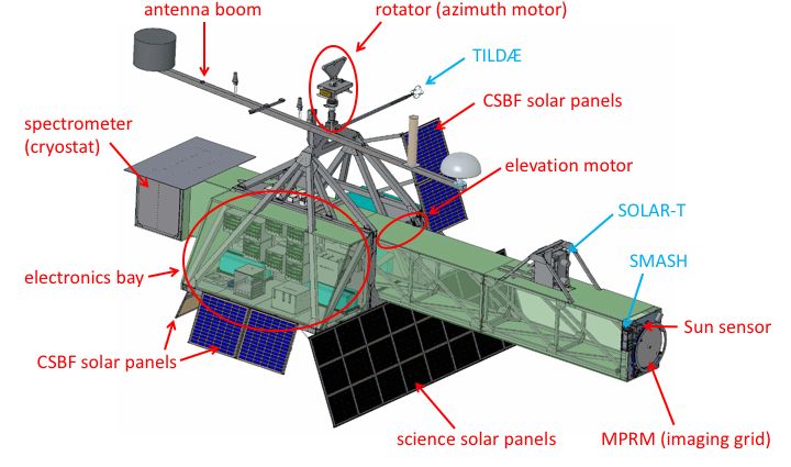 Complementarily, the GRIPS mission carried onboard three piggyback instruments. The first two had scientific goals related to the GRIPS ones: SOLAR-T aimed to observe the full-disk Sun at 3 and 7 THz with high sensitivity and sub-second time resolution using Golay cell detectors placed at the focus of two 7.6 cm Cassegrain telescopes and SMASH a technological demonstration of a new miniaturized hard X-ray (HXR) detector for future use on CubeSats and other small spacecraft. These payloads were developed by the Mackenzie Presbyterian University in Brazil, and the Southwestern Research Institute of New Mexico, respectively and were mounted on the telescope boom to ensure that they would be continuously pointing at the Sun during the long-duration flight. The third piggyback instrument was TILDAE an experiment developed by the NCAR, ENS Lyon, and the Universities of Delaware and Berkeley, which encompassed a sonic anemometer to measure the propagation time of sound waves, to infer wind velocity and air temperature at a 200 Hz cadence.