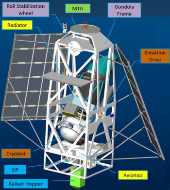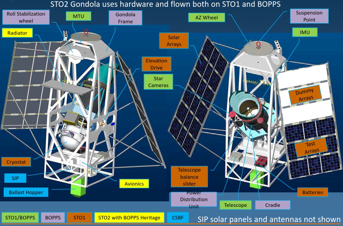 At left we can see an scheme of the instrument (click for more details). The instrument used the same telescope that Johns Hopkins University Applied Physics Laboratory (APL) has previously employed for its successful Flare Genesis Experiment back in the 1990's decade. Same occurs with the gondola inherited from the APL which was originaly used for the Flare Genesis and Solar Bolometric Imager balloon programs. The main detector installed on the focal plane of the telescope was a high spectral resolution heterodyne receiver system, used in the previous version of the instrument (STO-1 flown in 2012) but upgraded for extended cryogenic lifetime, enhanced sensitivity, and greater reliability. A second detector is an uncooled, Schottky receiver.
