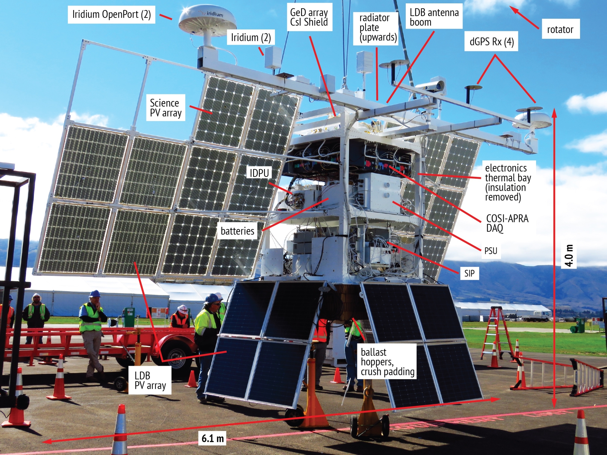 The COSI cryostat was located at the top of a three-tier solar-oriented gondola, with the instrument axis fixed towards the zenith. The COSI 2016 gondola measured 1.5m × 1.5m × 2.2m (without the solar panels and antenna booms), weighed 2950 lbs, and was flown with 400 lbs of suspended ballast. To withstand the thermal variations in flight, the top two tiers of the COSI gondola were encased in 1-inch extruded polystyrene foam and a layer of aluminized mylar. COSI was fitted with a fixed solar PV array and batteries with 480 Ah capacity. A rotator provided rough solar pointing to charge the PV arrays. COSI had no pointing requirements, but data from 2 onbard GPS systems and a magnetometer enabled an accurate reconstruction of the location and pointing during flight.
