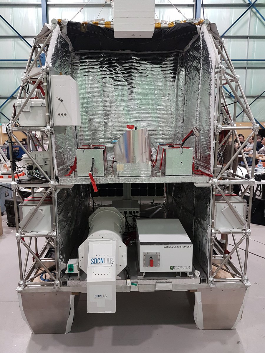 ALI V2 (Aerosol Limb Imager Version 2) an atmospheric monitoring tool that can measure the concentration of aerosols in the upper atmosphere using a unique optical device. The instrument, developed by the University of Saskatchewan, is an improved version of the prototype which was flown in a previous balloon mission from Timmins, Canada in 2014, and can detect a wider range of optical wavelengths, allowing it to more precisely measure the size of aerosol particles.