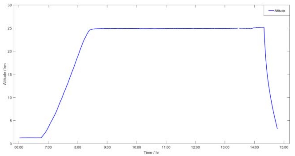 took approximately 110 minutes before the balloon reached float altitude, a total of 22 kg of ballast was dropped in several increments to pressurize the super-pressure balloon. The balloon remained afloat at 25 km for about 5 hour and 45 minutes before cut down. After the balloon completed its scheduled flight mission, both the payload and the balloon itself were successfully recovered. Total flight time was 8 hours.