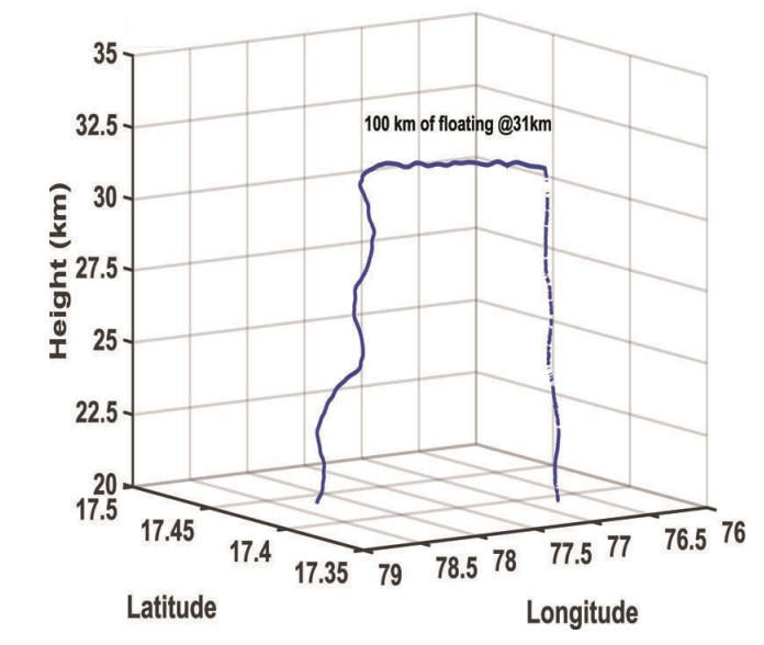 The experiment consisted in launching a zero-pressure polyethylene (ZP) balloon along with a GPS sonde and let it drift in the horizontal direction in the stratosphere at ~31 km to measure wind, temperature and pressure for about 100 km distance from the Tata Institute of Fundamental Research-Balloon Facility (TIFR-BF) at Hyderabad. It was the first time such an experiment was carried out in India.