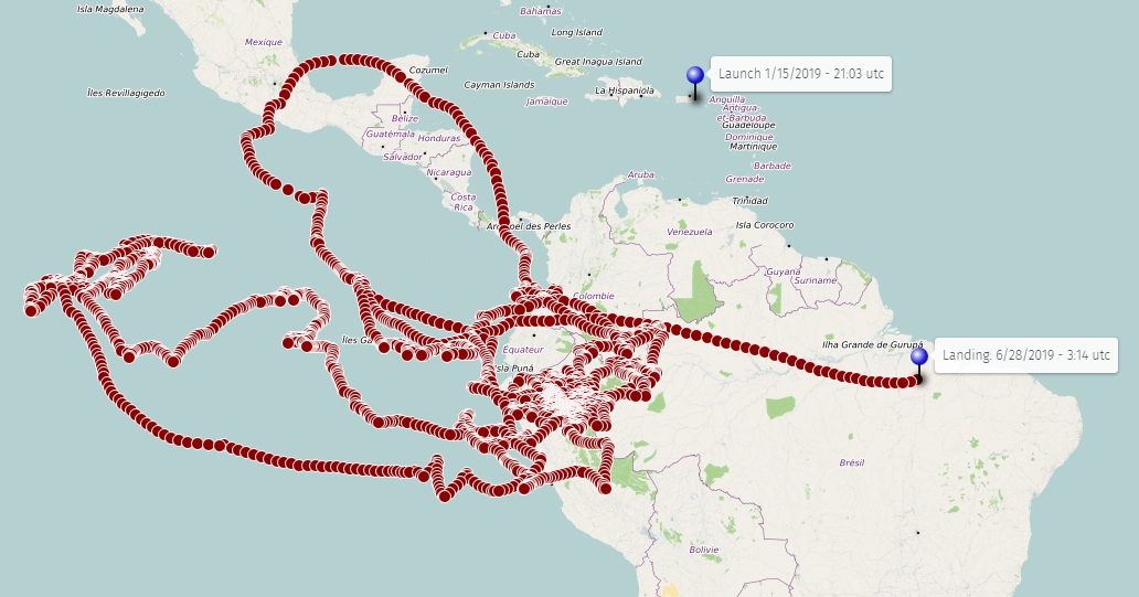 The balloon was launched from Jose Aponte de la Torre airport, in Ceiba, Puerto Rico at 21:03 utc on January 15th, 2019. After a total flight time of 164 days it was terminated over Brazil on June 28th, 2019.