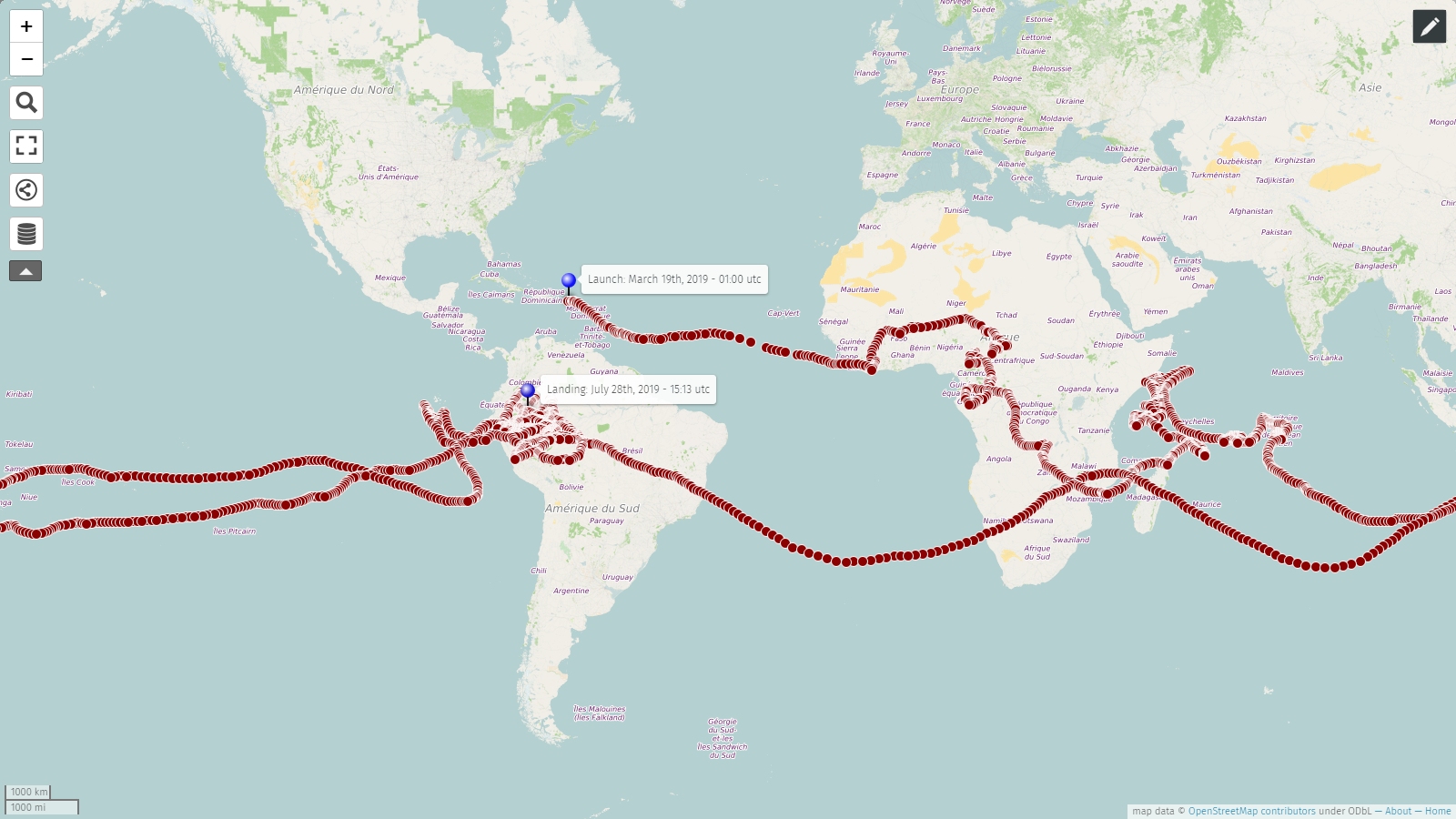 The balloon was launched from Jose Aponte de la Torre Airpot on Ceiba, Puerto Rico on March 19 at 1:00 utc and remained in flight 131 days performing two turns to the world. It landed on July 28, 2019 at 15:13 utc 23 km SE of Santa Clotilde, in Loreto department, in the Peruvian rainforest.