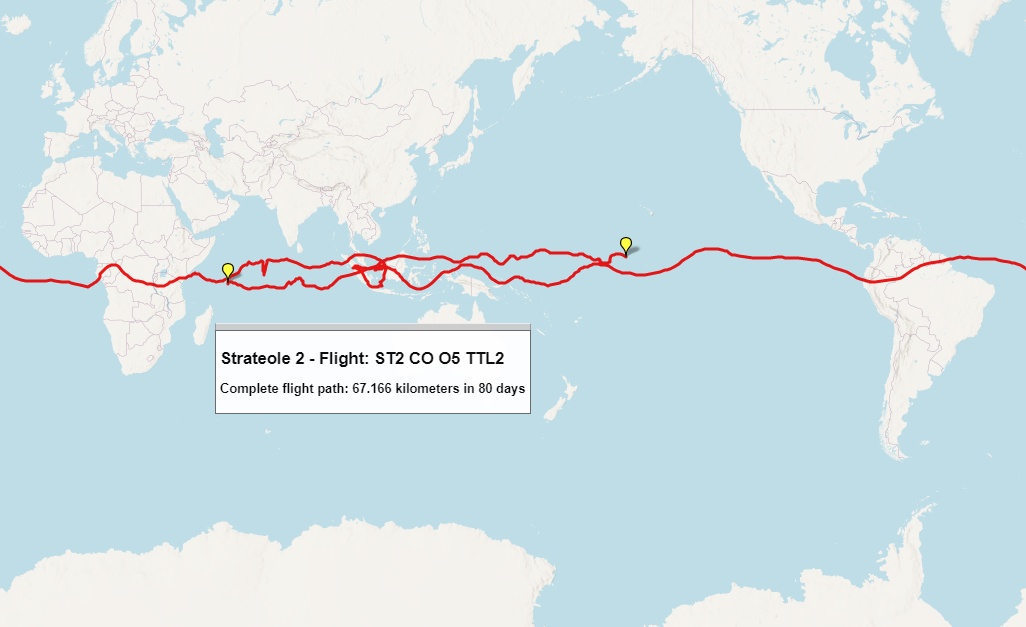 Strateole-2 is a French-US project to study climate processes in the Tropical Tropopause Layer (TTL) and in the lower stratosphere. The project is based in the use of CNES superpressure balloons, capable of drifting for several months between 18 and 20 km altitude. The effort will release a total of nearly 50 long-duration balloons in three separate campaigns between 2019 and 2024. During each Strateole-2 campaign two series of balloons were flown at different altitudes: one above the tropopause -the boundary between the troposphere and the stratosphere- nomenclated as STRAT at about 20,000 metres and the other at around 18,000 metres, at the top of the tropopause nomenclated as TTL. The first series of flights focuses primarily on remote measurements, and the second on in-situ measurements.