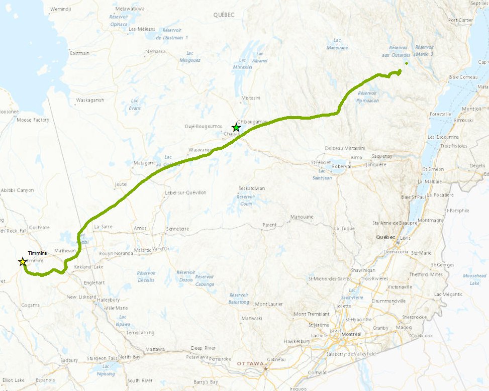 This was the third flight of the PILOT instrument. The balloon was launched from the Timmins Stratospheric Balloon Base in Ontario, Canada on September 24 2019 at 5:36 AM local time. The experiment reached ceiling altitude about 2.3 hr after launch. The instrument reached an altitude of 39 km, slowly decreasing to 37 km during the first day of the flight. The altitude decreased to 34 km during the night due to the lower buoyancy force of the balloon. During the second day, the altitude rose again, reaching 37.5 km just before the gondola was dropped in Quebec. The balloon followed a trajectory towards the north-east during most of the flight as can be seen in the map above. The gondola landed north of Saguenay, Quebec and was brought back to the Timmins base using a helicopter and a truck.