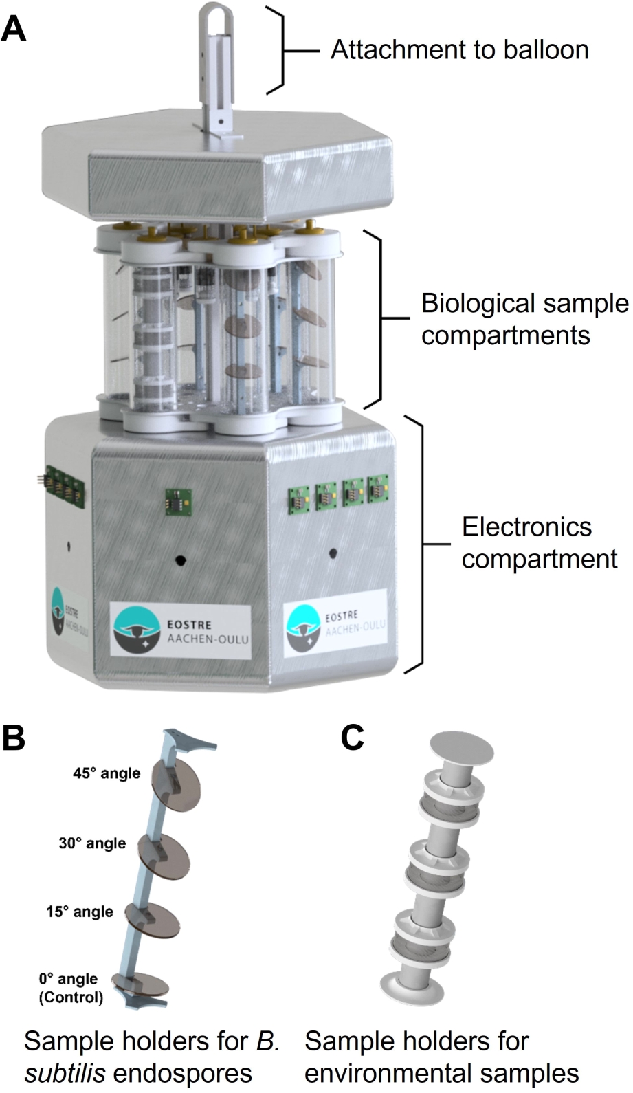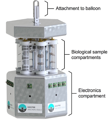 The EOSTRE project (Experiment on Outliving microorganisms under STRatospheric Environment) goal was to test the influence of the extreme conditions in the stratosphere on microorganisms and their survival as well as on possible mutagenic effects of the strong radiation. A sample gondola was built with inclined sample holders that allowed exposure of endospores and known extremophilic microorganisms to radiation at different intensities. Moreover, three environmental samples (soil and sediment) were placed in the sample gondola to test the effect of stratospheric conditions on complex microbial communities.